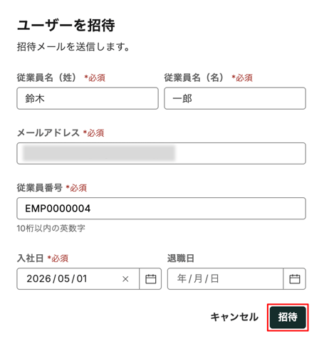 - 招待する従業員の「従業員名(姓)」「従業員名(名)」「メールアドレス」「従業員番号」「入社日」を入力し、画面右下の[招待]を押すと、対象の従業員に招待メールが送付されます。