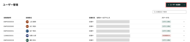 - 「ユーザー管理」画面で、招待メールを再送した従業員の「ステータス」が「招待済み」と表示されていることを確認します。