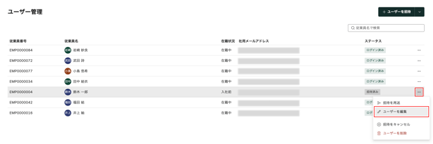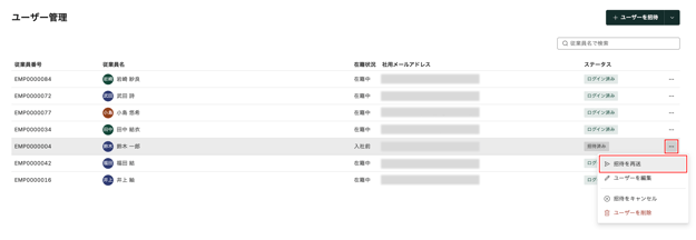 本手順は、まだ一度もログインしていない従業員で、招待メールの有効期限が切れてしまった場合に招待メールを再送するための操作です。