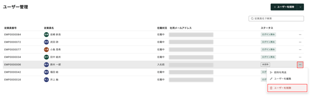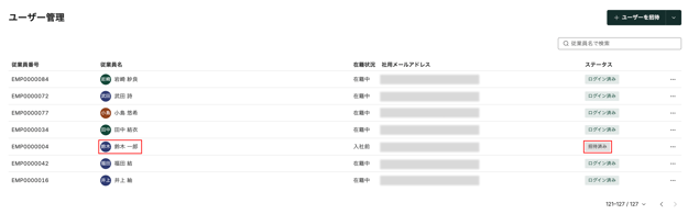 - 「ユーザー管理」画面で、招待を削除した従業員が表示されないことを確認します。