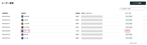 - 「ユーザー管理」画面で、招待した従業員の「ステータス」が「招待済み」と表示されていることを確認します。
