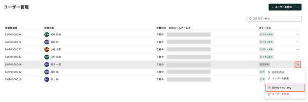 従業員のアカウントを管理する「ユーザー管理」画面について解説します。この画面では、招待メールの送信や再送(再招待)、招待の取り消し(キャンセル)、アカウントのステータスの確認などが可能です。