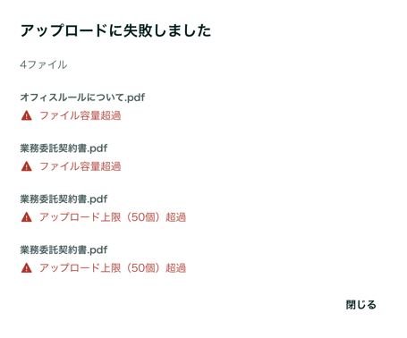 - 「アップロードに失敗したファイルが◯個あります」というエラー表示は、画面を再読み込みするか、別の画面に移動すると消えます。