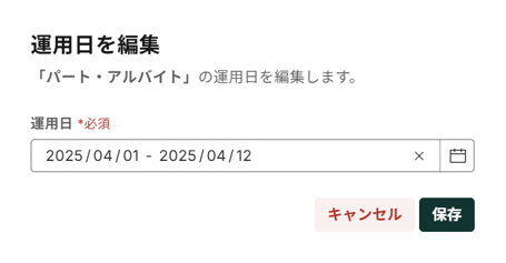- 運用日を変更する「雇用形態名」の行の右端の[…]を押し[編集]を選択すると「運用日を編集」画面に移動します。